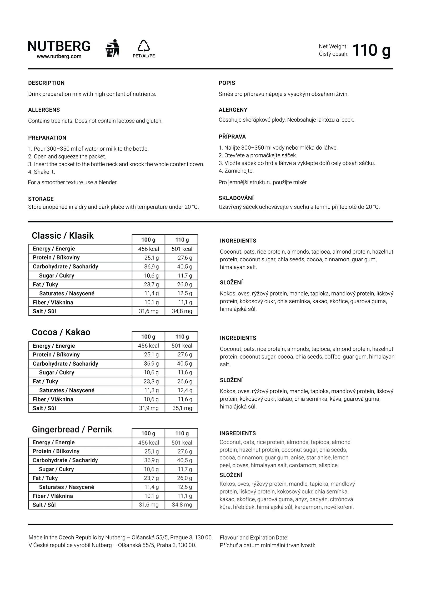 Nutberg was a complete meal in a natural nutty drink. It served as a simple and tasty meal on the go. One packet weighed 110 g and contained one meal. The drink was available in three flavors: Classic, Cocoa, Gingerbread.